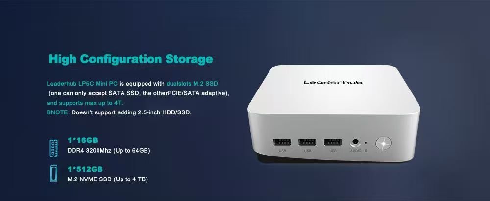 | Storage | 512GB M.2 NVMe SSD (Max. support up to 4TB via dual M.2 slots) *Note: Does not support 2.5-inch SATA HDD/SSD.* |