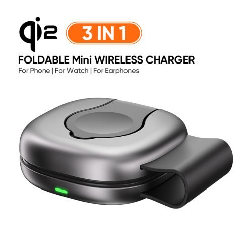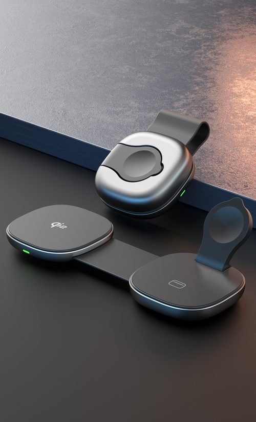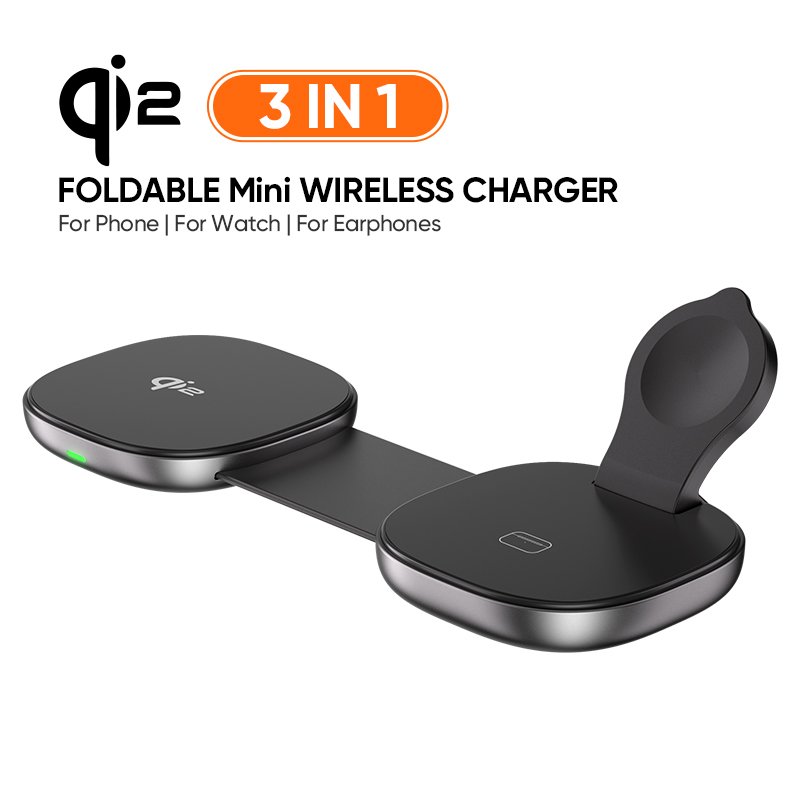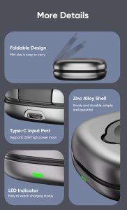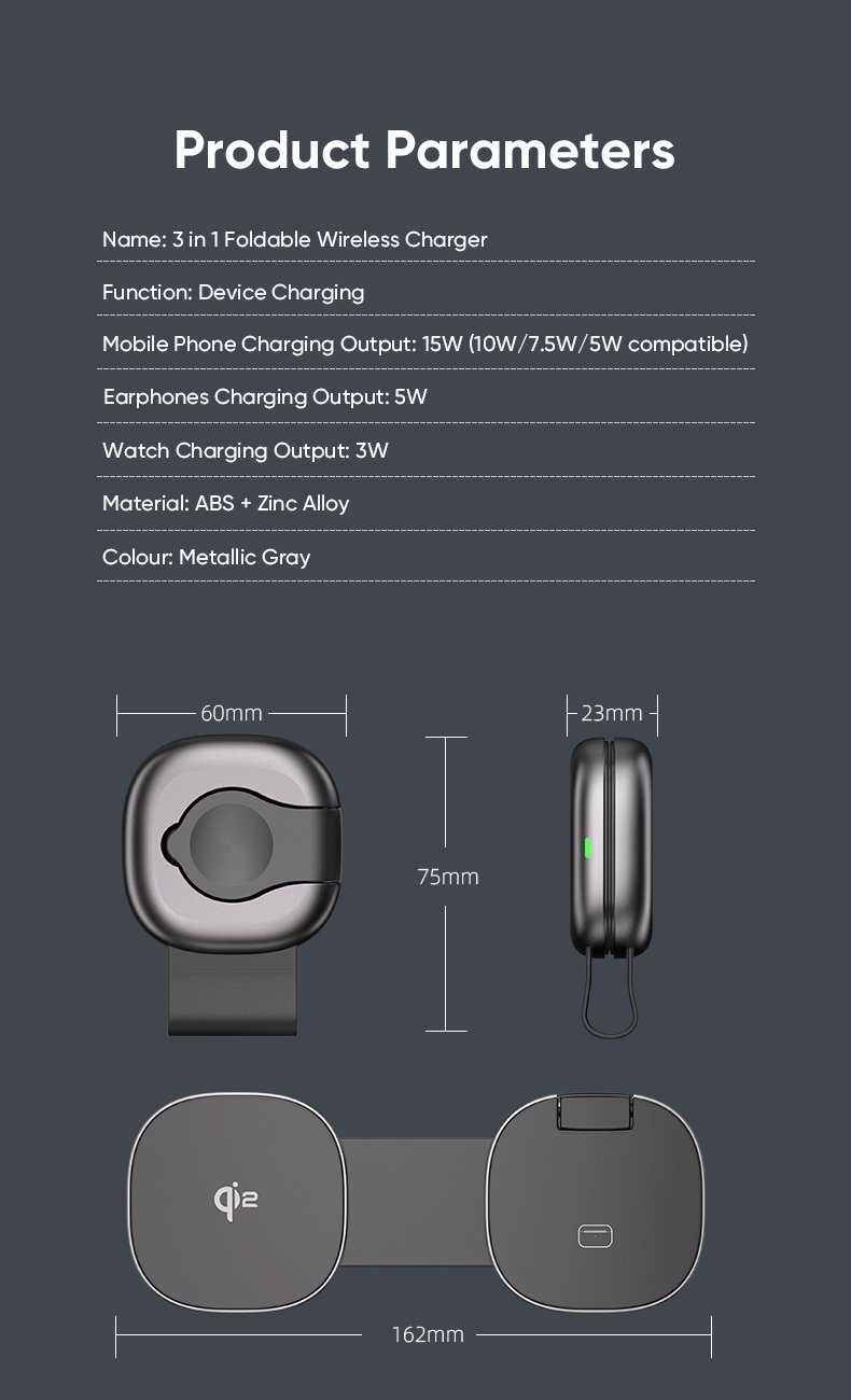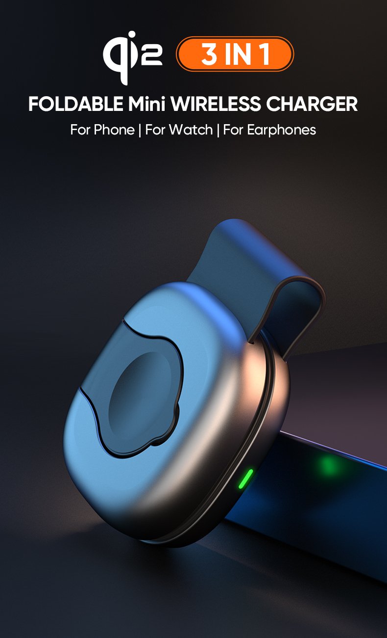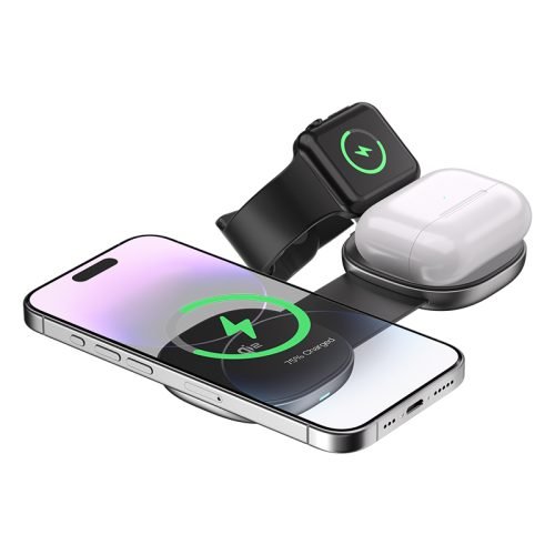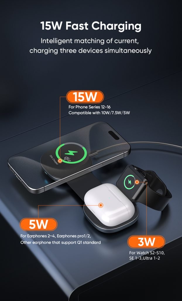 The Multifunctional 3 in 1 Wireless Magnetic Charger is a 15W foldable stand-up fast charging station designed for iPhone, AirPods, and Apple Watch.