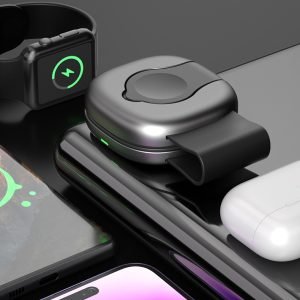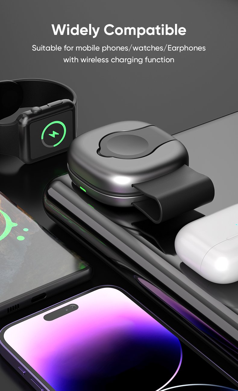 - It offers 15W fast charging and can intelligently match the current to charge three devices simultaneously. For phone series 12 – 15, it is compatible with 10W/7.5W/5W. The earphones charging output is 3W, suitable for models like Earphones 2/3, Earphones pro1/2, and other Qi-standard earphones. The watch charging output is 2.5W, compatible with Watch S2 – S9, SE 1 – 3, Ultra 1 – 2.