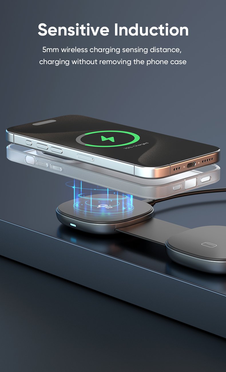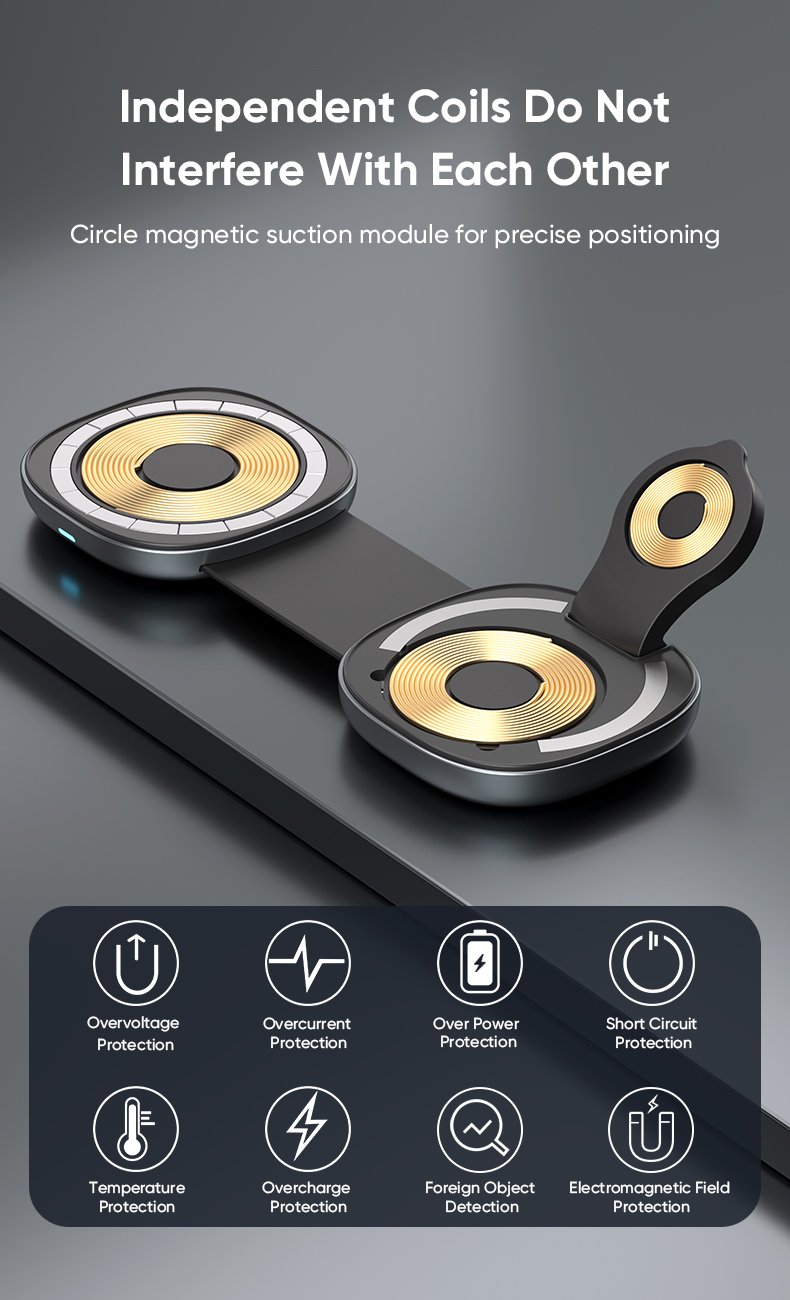 - The charger has a foldable panel design with freely adjustable charging angles. It uses a circle magnetic suction module for precise positioning and magnetic adsorption charging, which keeps the desktop neat and organized. It can also be used as a mobile phone holder for watching films while charging, with vertical screen mode for video chatting and live streaming, and landscape mode for watching TV shows and movies. In folded mode, it enables quick and easy charging with magnetic charging auto alignment.