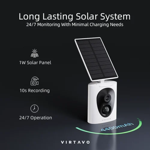 Meet the VIRTAVO Solar Flask 2-in-1 Solar-powered Outdoor Security Camera-Thanks to its solar-powered design, VIRTAVO keeps watch 24/7 without the hassle of frequent charging or messy wiring. Rain or shine, it’s built to withstand diverse outdoor climates, making it a reliable companion in any weather.