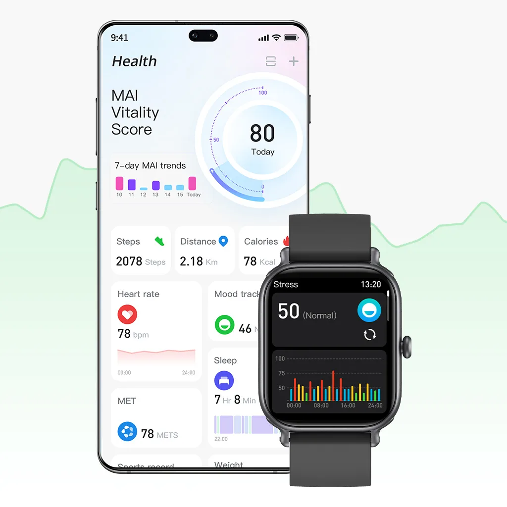- Advanced sensors for heart rate, SpO2, and HRV stress, 24/7 health monitoring