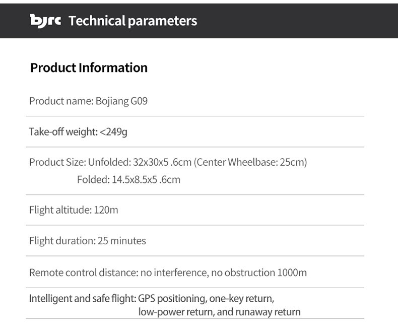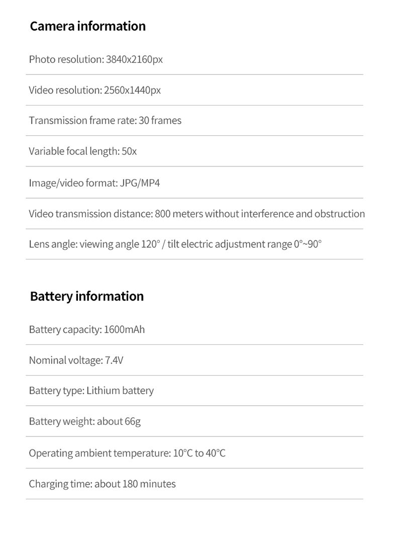 4. Battery Endurance: The stated flight time is measured with the aircraft flying at a constant speed of 12 km/h in a windless environment. Real-world battery life will vary based on flying style and conditions.