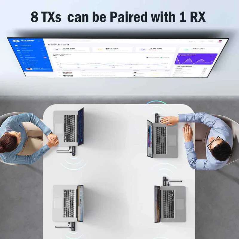 One receiver supports up to 8 transmitters with quick one-touch switching—ideal for meetings and shared presentations.