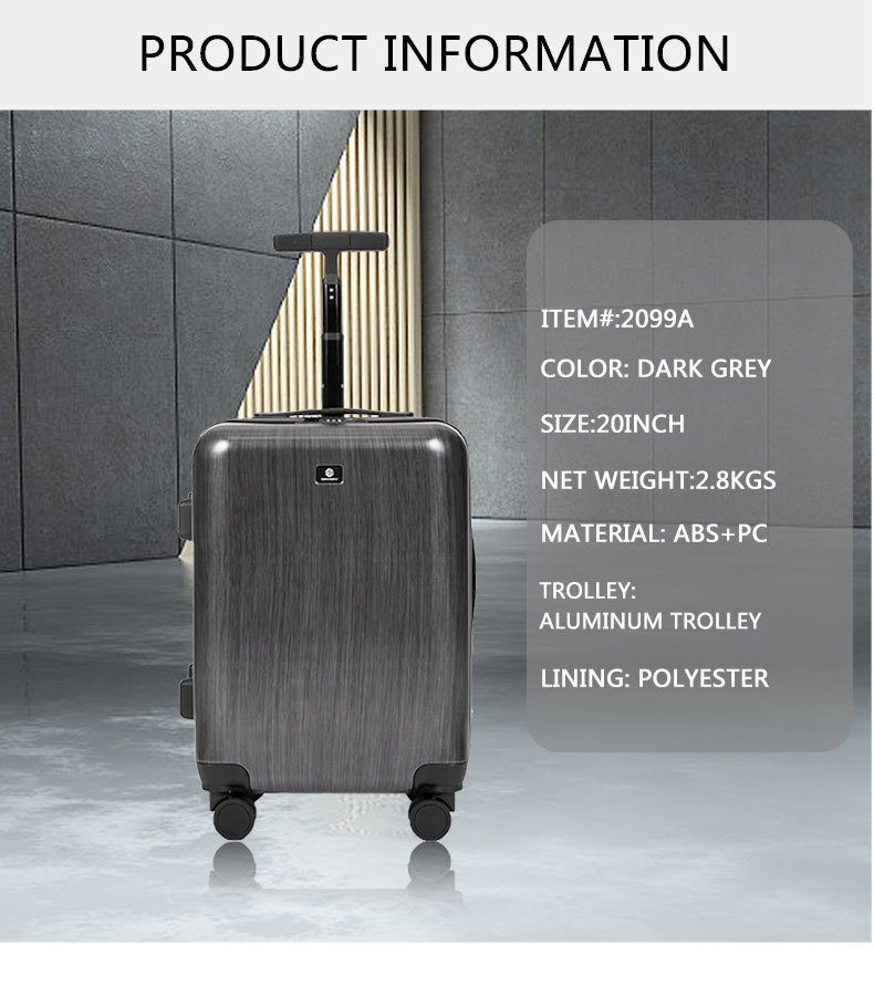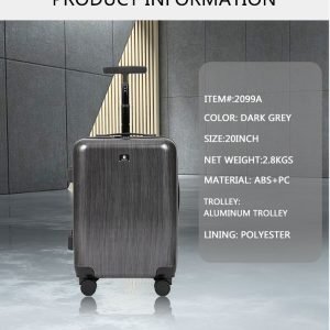 *Size:20″ *Color: grey *Material: PC *Usage :Holiday *Lock: Combination Lock *Packing: Carton *Style:Elegant *Handle: Soft Rubber Hard Plastic *Wheel:4 Spinner 360 Degree Wheels
