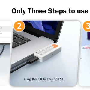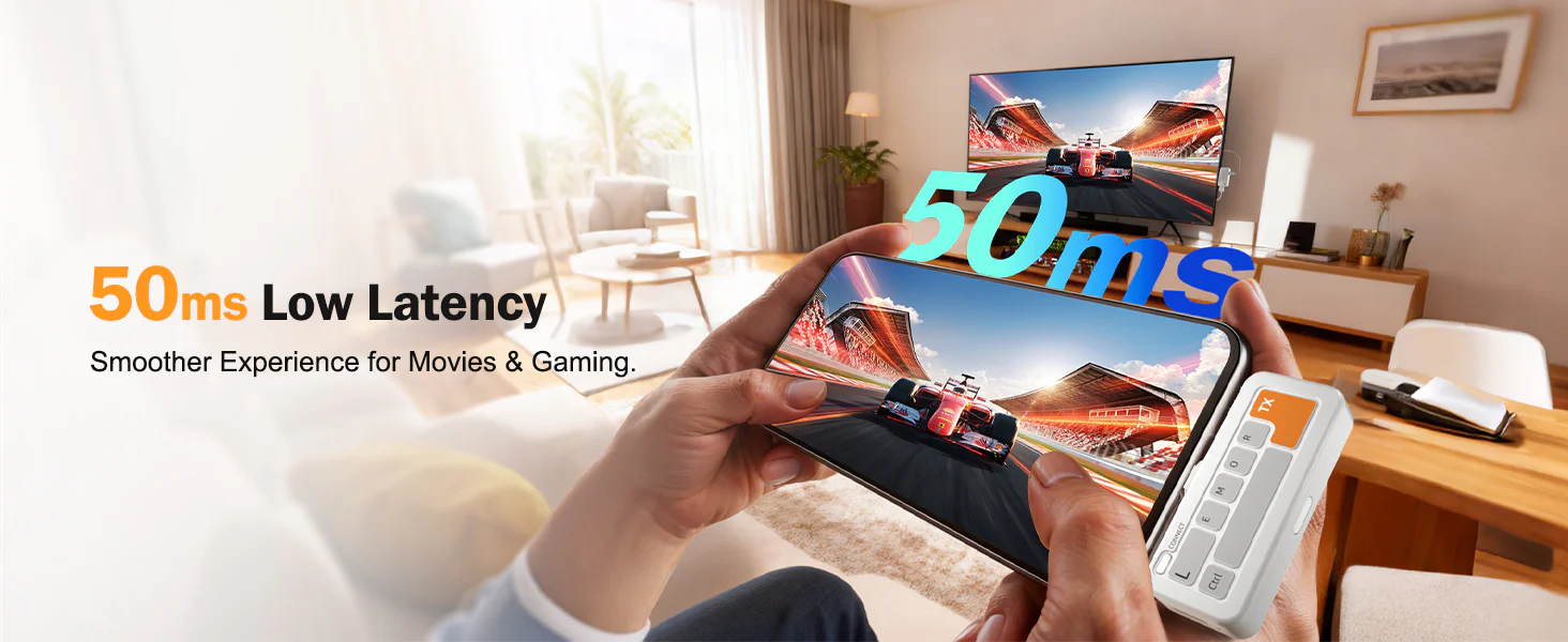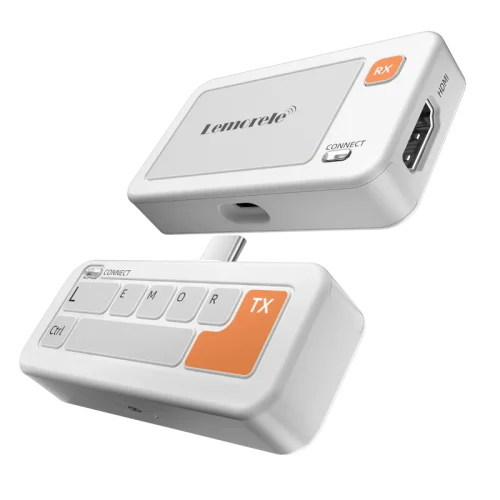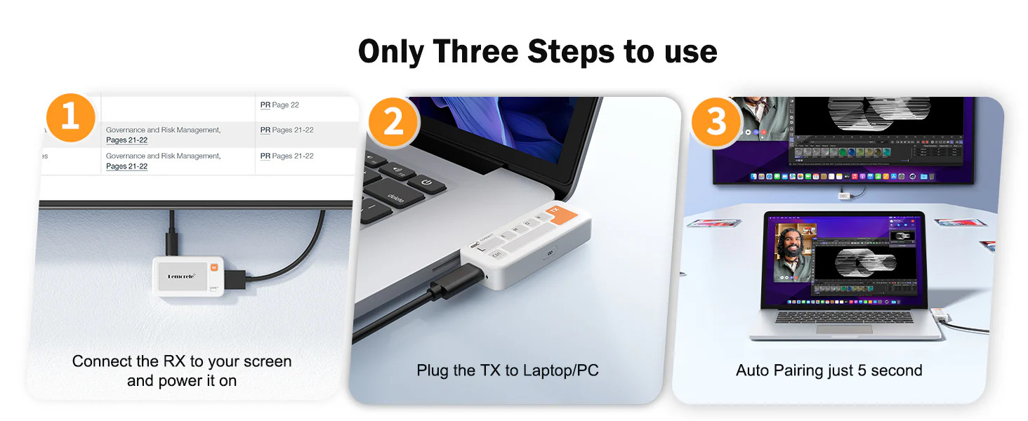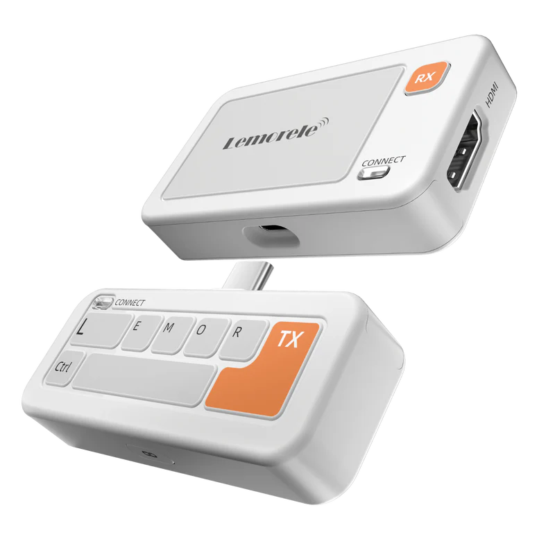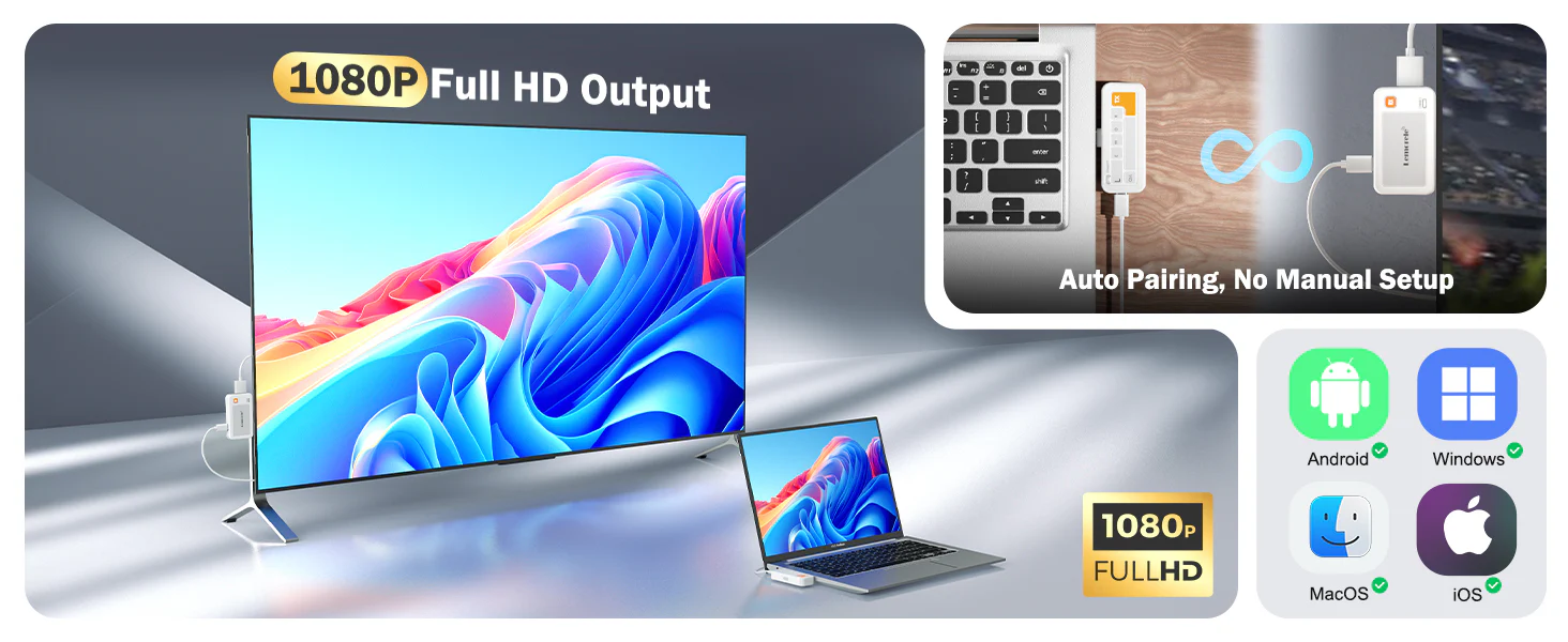 The transmitter connects to a phone or other device via USB-C, while the receiver outputs to a display or projector via HDMI. It automatically pairs without the need for drivers or apps—just plug in and start using.