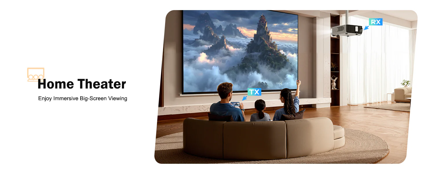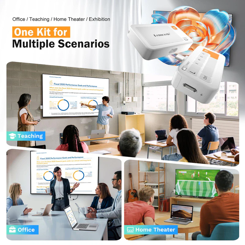 Compact and portable design, easy to carry, ideal for home theaters, business meetings, classroom projection, and exhibitions, allowing you to enjoy wireless HD screen mirroring anytime and anywhere.