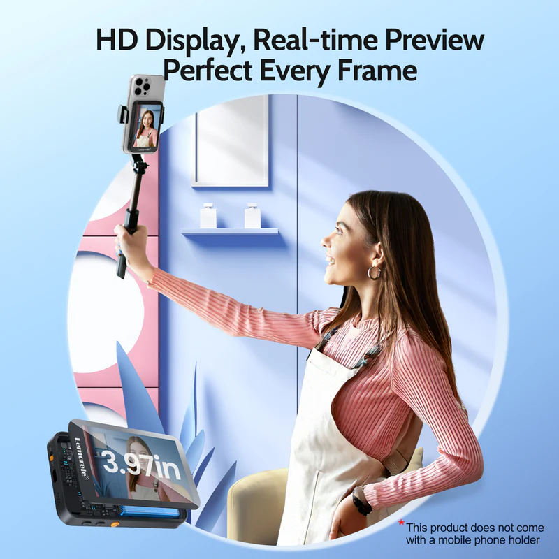 Equipped with a 3.97″ IPS full-view screen at 800×480 resolution, the R600 provides a real-time visual from your phone’s rear camera. This means you can check your angle, lighting, and pose while using the superior rear lens—without guessing. Whether you’re capturing portraits, filming tutorials, or doing hands-free video content, it helps ensure your visuals are sharp, centered, and confidently composed.
