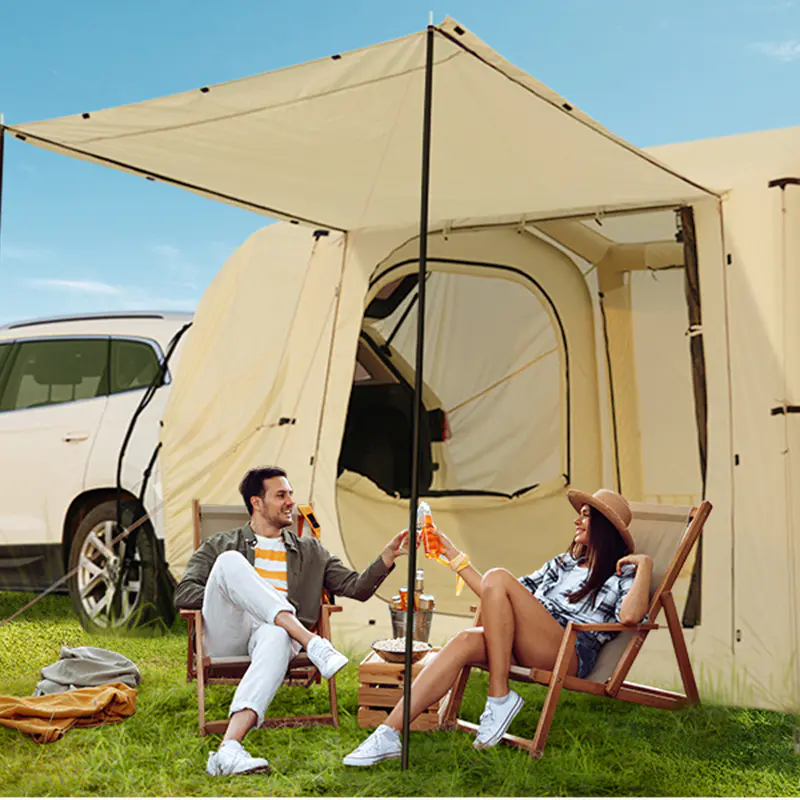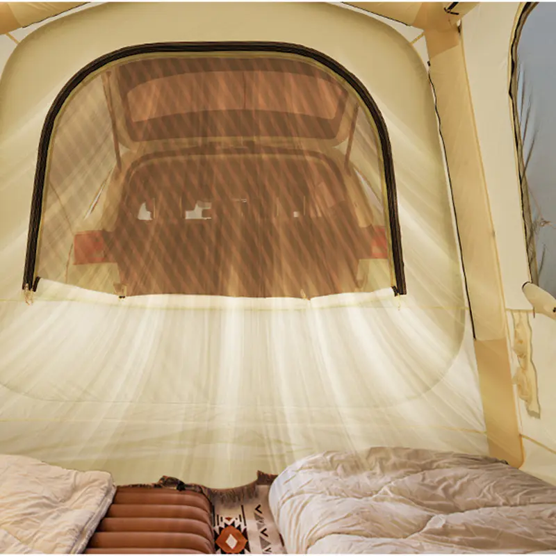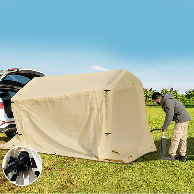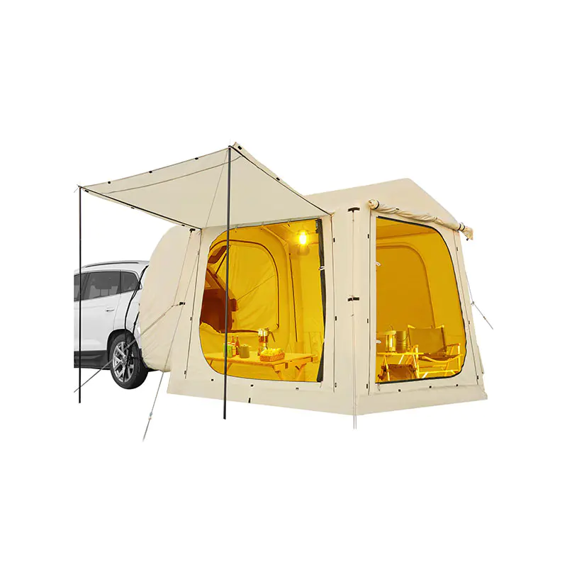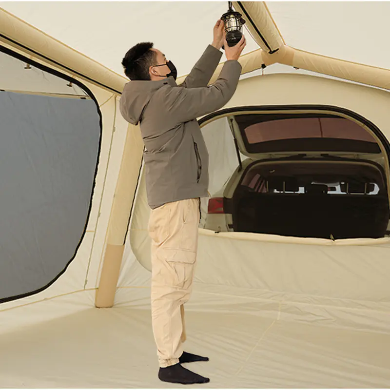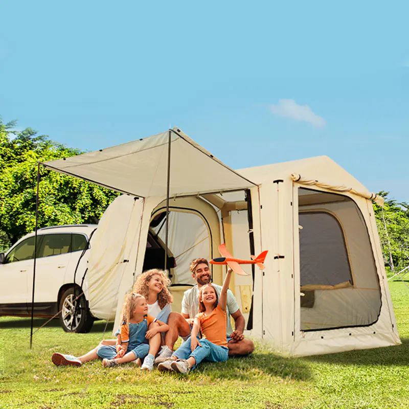 Dual-use mode: Rear connection: It can be conveniently connected to the rear of an SUV or other vehicle to form an expanded camping space.2. Independent setup: It can also be used as an independent traditional camping tent, adapting to different campsite environments.3. Spacious interior: The tent has ample interior space and is designed to comfortably accommodate 4 to 6 people.4. Quick setup: Equipped with a dedicated air pump, the tent can be easily inflated within five minutes, significantly saving setup time and effort.5. Practical Design: Double-door structure: Equipped with two entrances and exits for convenient entry and exit and enhanced ventilation. A foyer pole is included, which can be used to expand the foyer area and provide additional shade and rain protection space. The tent fabric has excellent waterproof and sun-proof performance, which can cope with the changeable outdoor weather and is suitable for camping all year round.