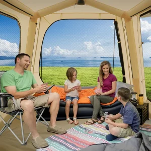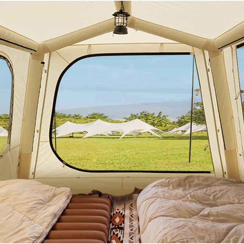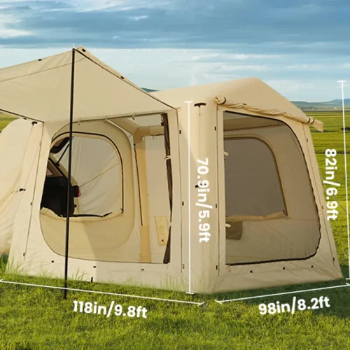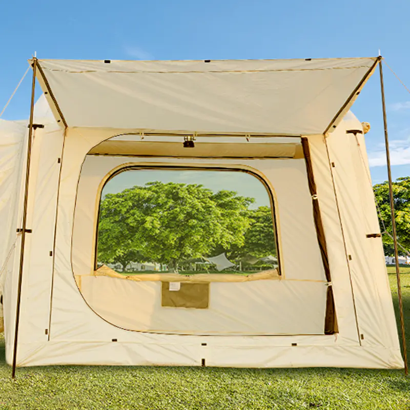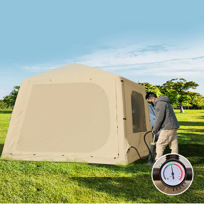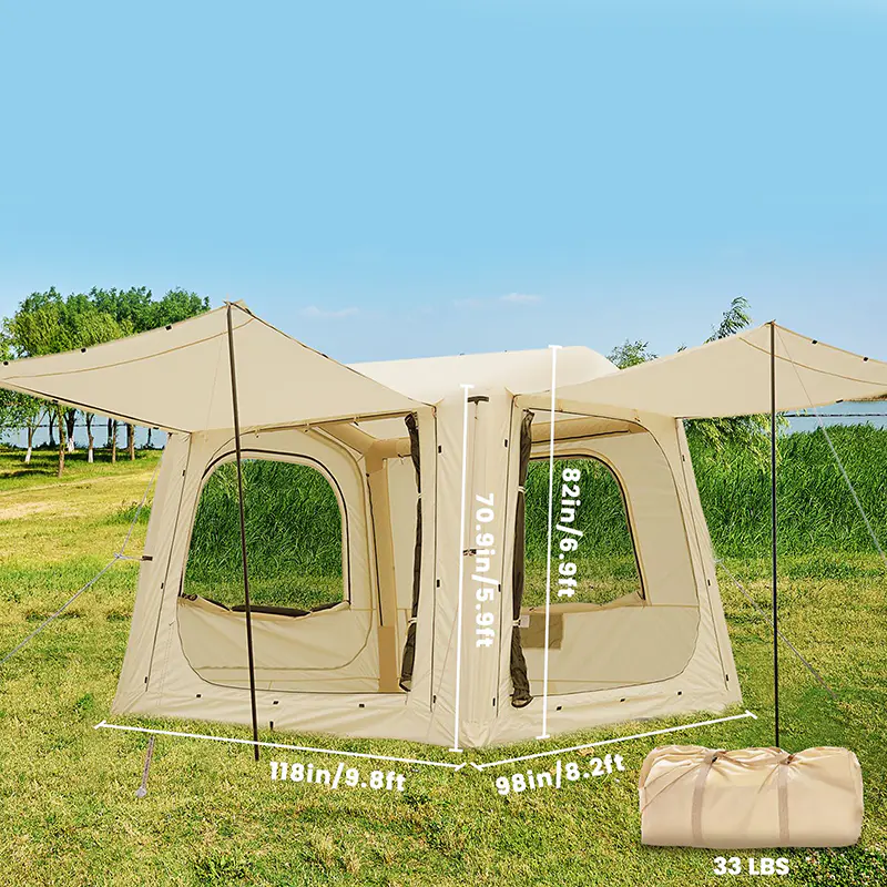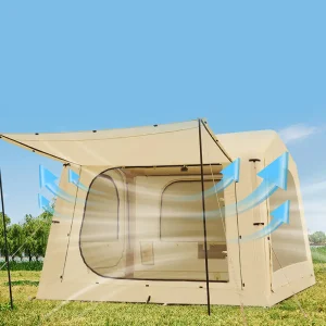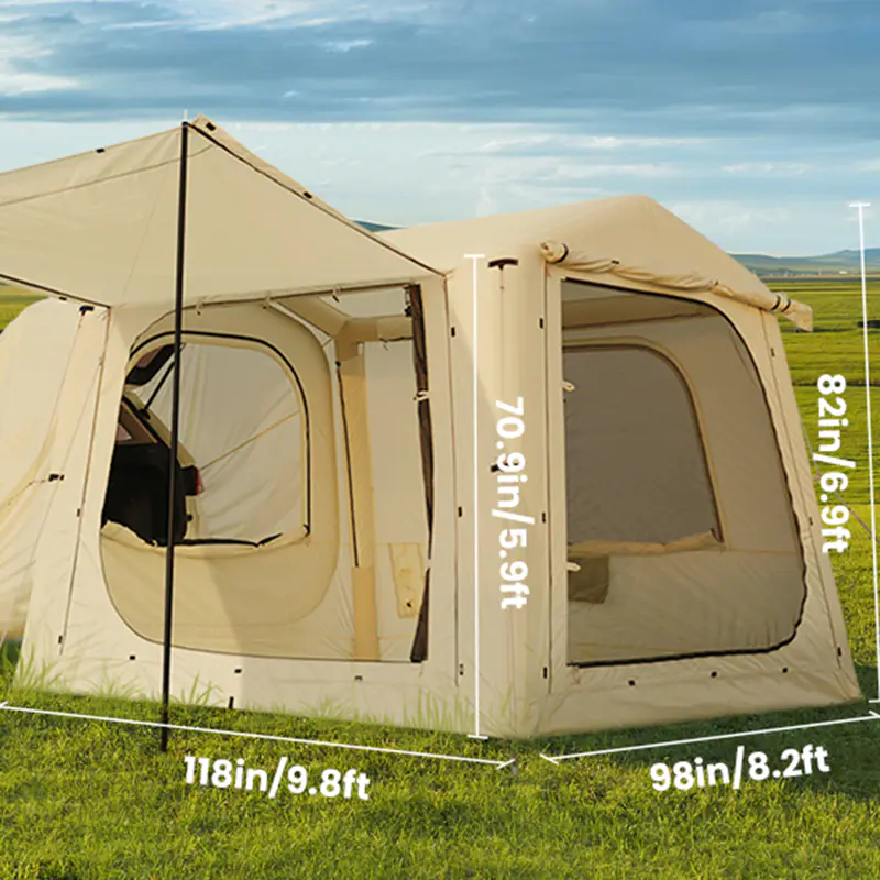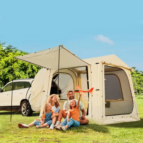 Dual-use mode: Rear connection: It can be conveniently connected to the rear of an SUV or other vehicle to form an expanded camping space.2. Independent setup: It can also be used as an independent traditional camping tent, adapting to different campsite environments.3. Spacious interior: The tent has ample interior space and is designed to comfortably accommodate 4 to 6 people.4. Quick setup: Equipped with a dedicated air pump, the tent can be easily inflated within five minutes, significantly saving setup time and effort.5. Practical Design: Double-door structure: Equipped with two entrances and exits for convenient entry and exit and enhanced ventilation. A foyer pole is included, which can be used to expand the foyer area and provide additional shade and rain protection space. The tent fabric has excellent waterproof and sun-proof performance, which can cope with the changeable outdoor weather and is suitable for camping all year round.