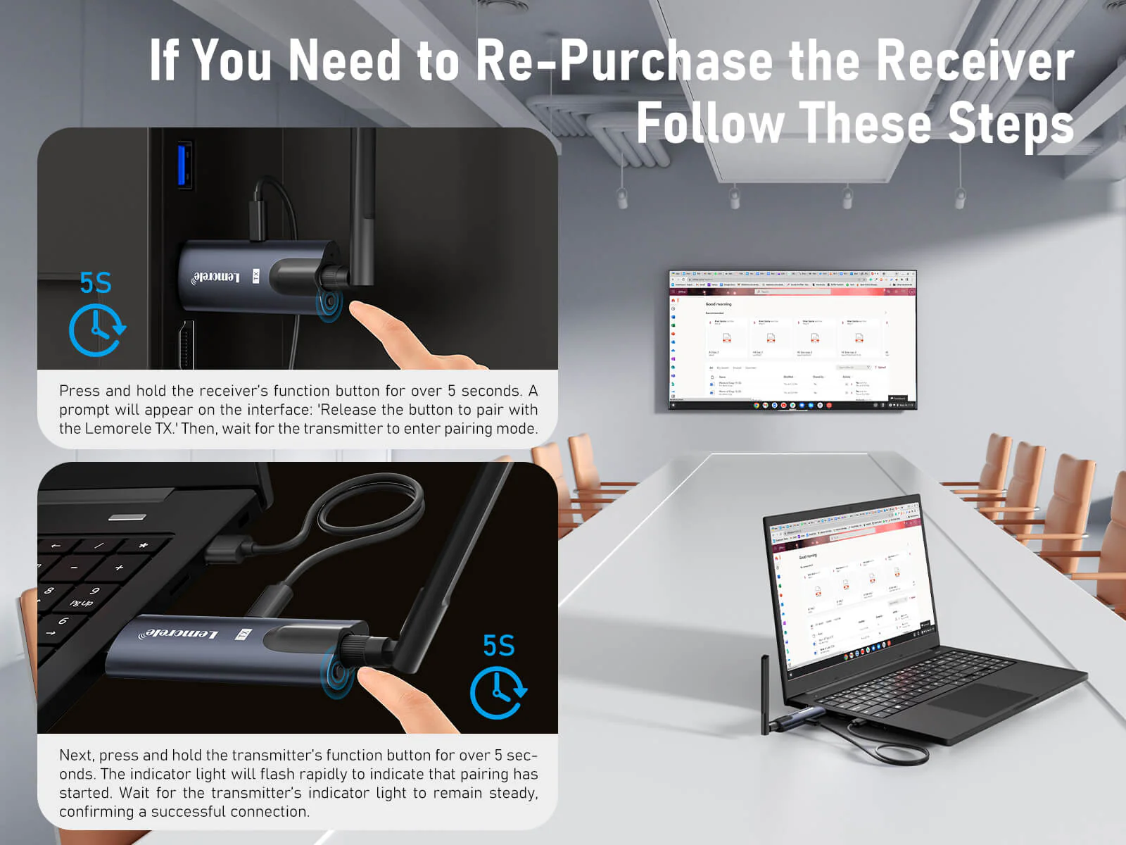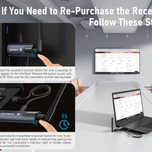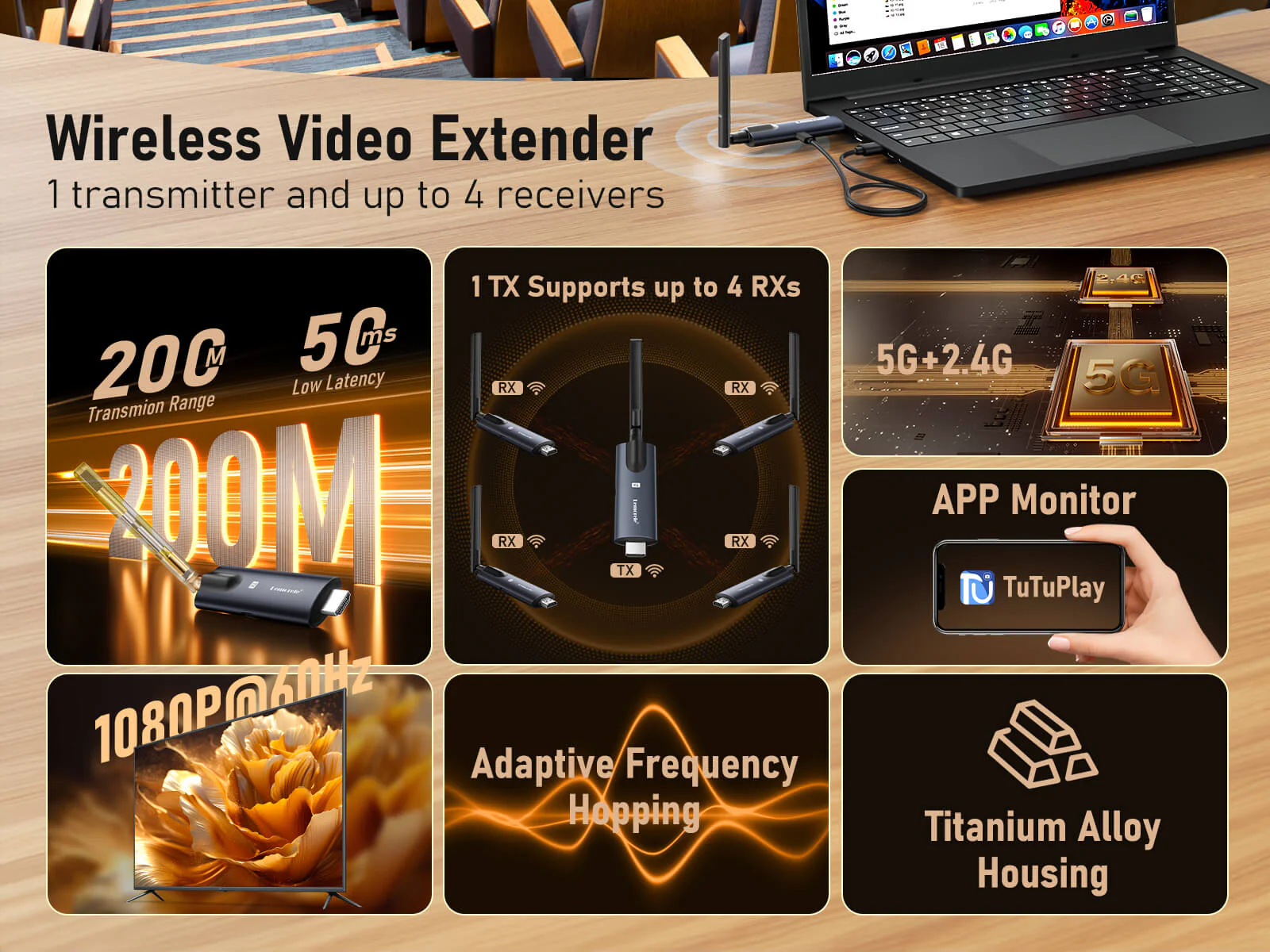 One transmitter supports up to 4 receivers simultaneously, making it ideal for multi-screen broadcasting in events, lecture halls, and command centers.